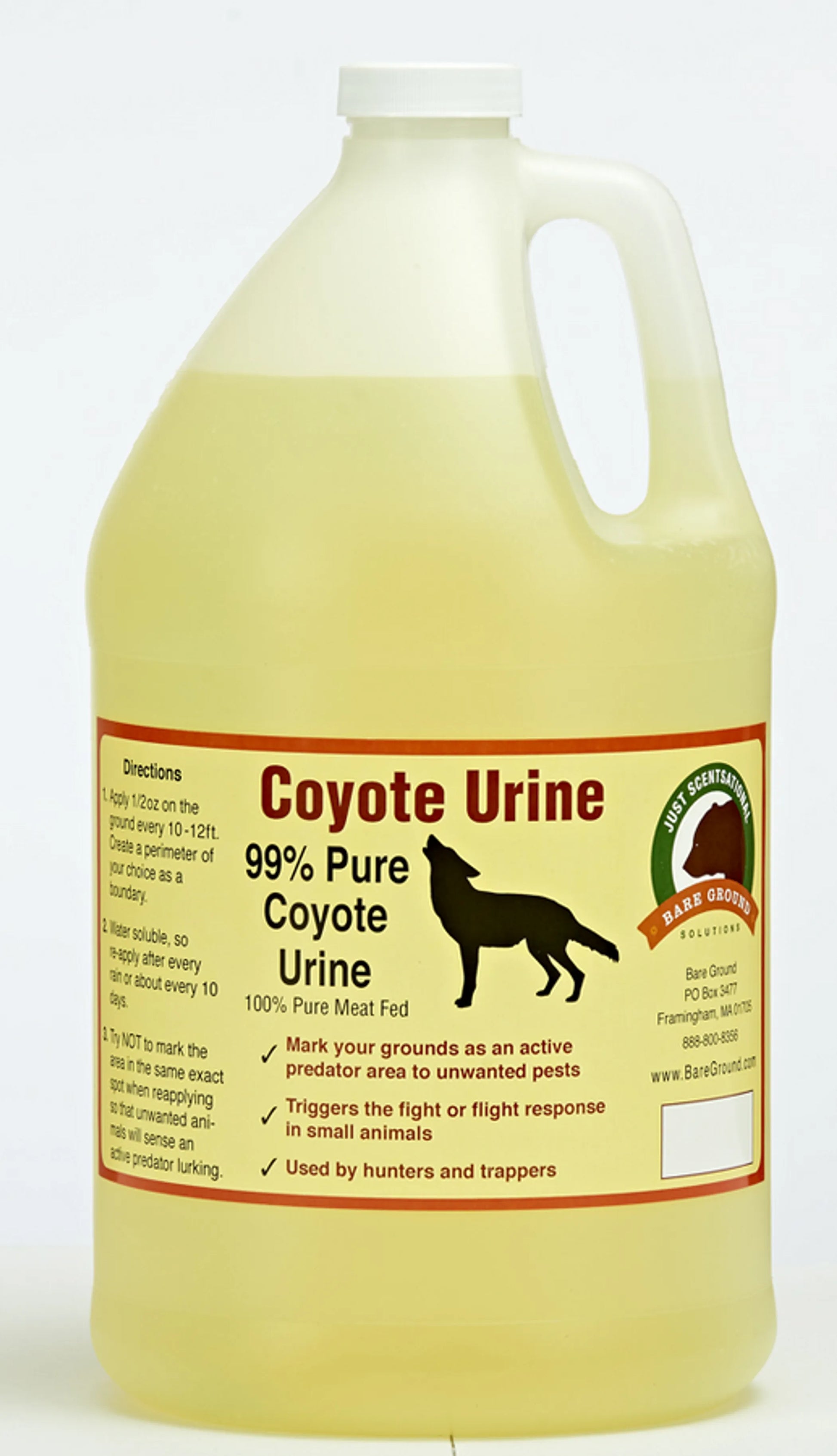One Gallon of Coyote Urine Predator Scent to repel unwanted animals. Predator scent keeps unwanted pests way from home and garden. All organic. Uses fear factor to repel. Use as a recharge for our Scentry Stones (sold separately), or by themselves.